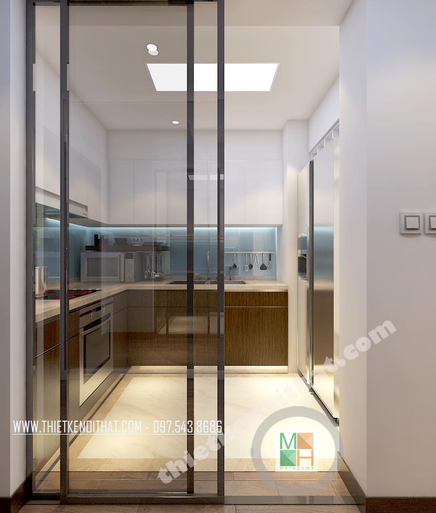 Nhìn tổng thể cả không gian nhà bếp, đây được coi như một thiết kế có chủ ý của tác giả. Một hiện thực cuộc sống với màu nâu của tủ bếp dưới như mặt đất, tiếp đến là một đại dương hiền hòa với kính ốp màu xanh và trên cùng là màu trắng tinh khôi như bầu không khí trong lành. Cuộc sống bình an này chính là ước mơ của biết bao nhiêu người. Nhà thiết kế sử dụng gam màu xanh làm kính ốp bếp như mong muốn mang đến cho sự hòa bình, hi vọng và sức sống cho những thành viên trong gia đình.