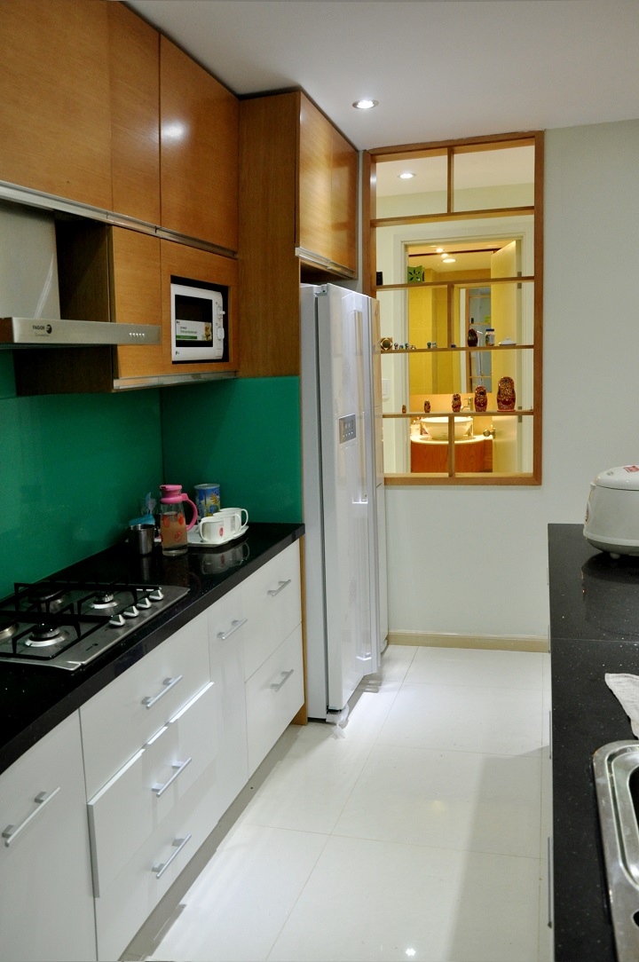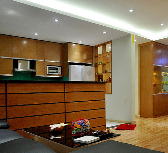 Cùng với kính ốp bếp màu xanh là hệ thống tủ bếp gỗ công nghiệp màu vàng sẫm, mang lại không gian ấp áp cho phòng bếp. Tủ bếp trên và dưới được làm từ gỗ công nghiệp dán veneer mang lại sự sáng bóng và vẻ đẹp hiện đại cho không gian này.
