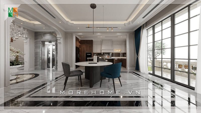 Thiết kế biệt thự với không gian mở gắn kết các thành viên trong gia đình với cách bố trí nội thất tân cổ điển sang trọng, đẳng cấp.